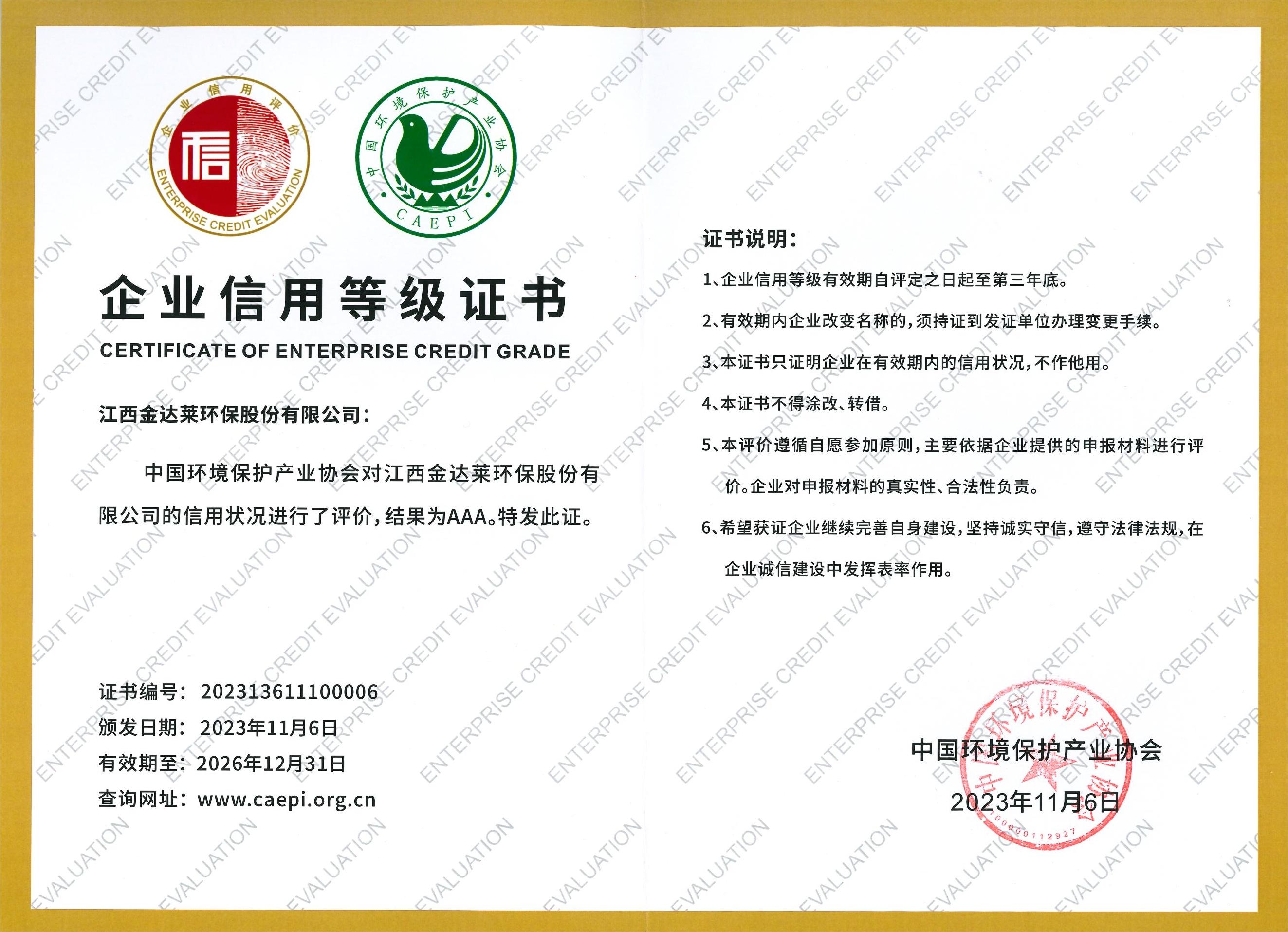 企业AAA级信用等级证书